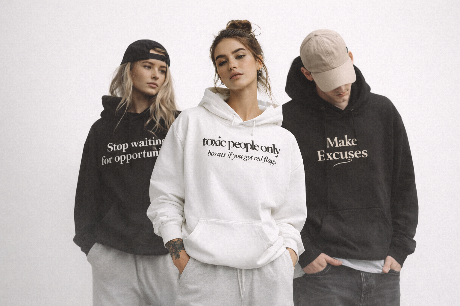 Clean graphic tees and oversized hoodies made for quiet confidence. A minimalist streetwear tee for self-aware personalities who wear their red flags instead of hiding them.